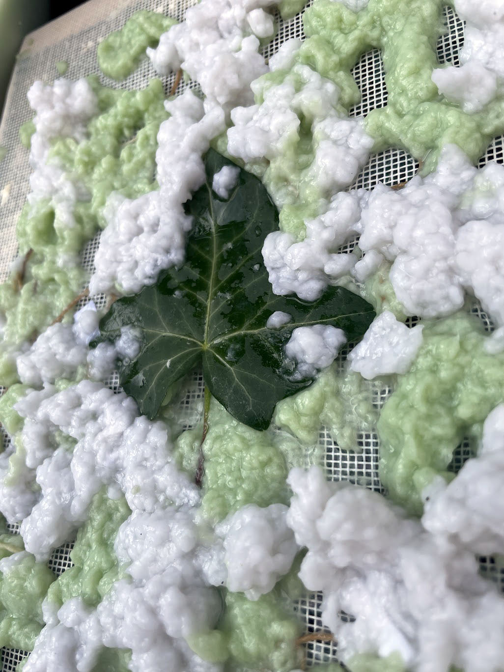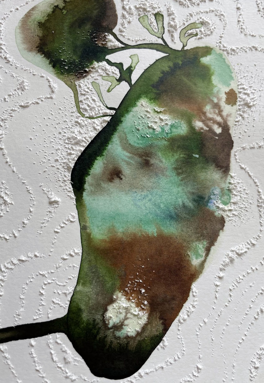 Dans ses expérimentations, le caractère symbiotique qui relie chaque chose et chaque être est perceptible. Le blanc qui apparaît vient former une entité, un réseau, des rythmes et des veines, des présences et des absences.