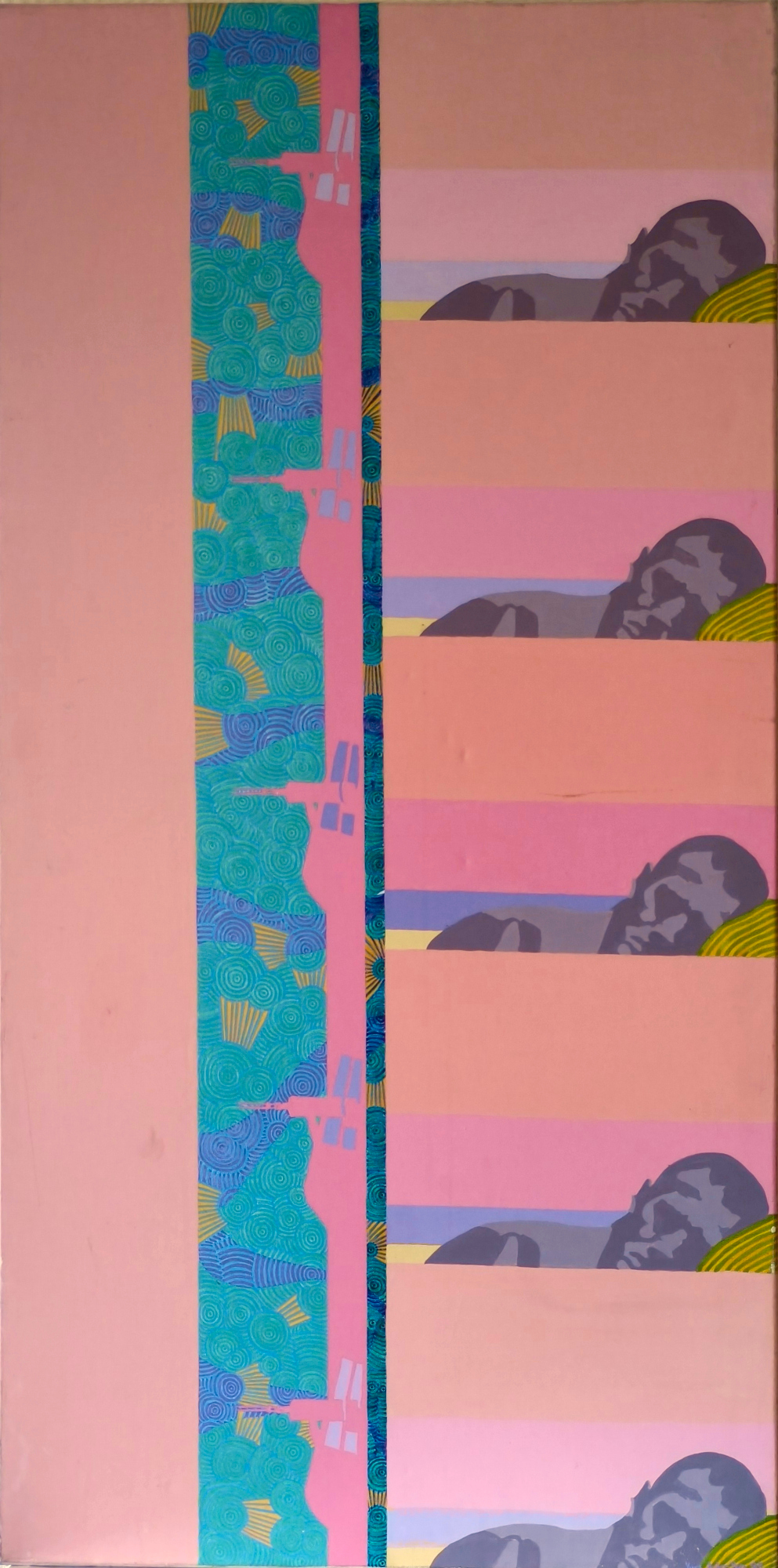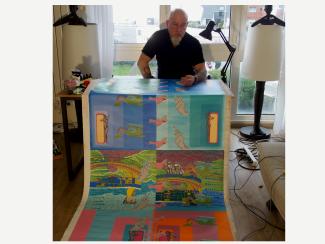 J'ai installé mon atelier chez moi. Ce qui me permets de travailler à n'importe quelle heure du jour ou de la nuit. Comme je travaille sur toile que roule et déroule, je n'ai pas besoin de trop de place. Je travaille toujours simultanément sur grand et petit format. Le petit format me permet d'approfondir, d'affiner les détails, de tester, pour appliquer ensuite à la réalisation définitive du grand format. Je travaille actuellement sur deux toiles de 2,5 mètres par un mètre, recto-verso, pour des expos prévues cet automne.