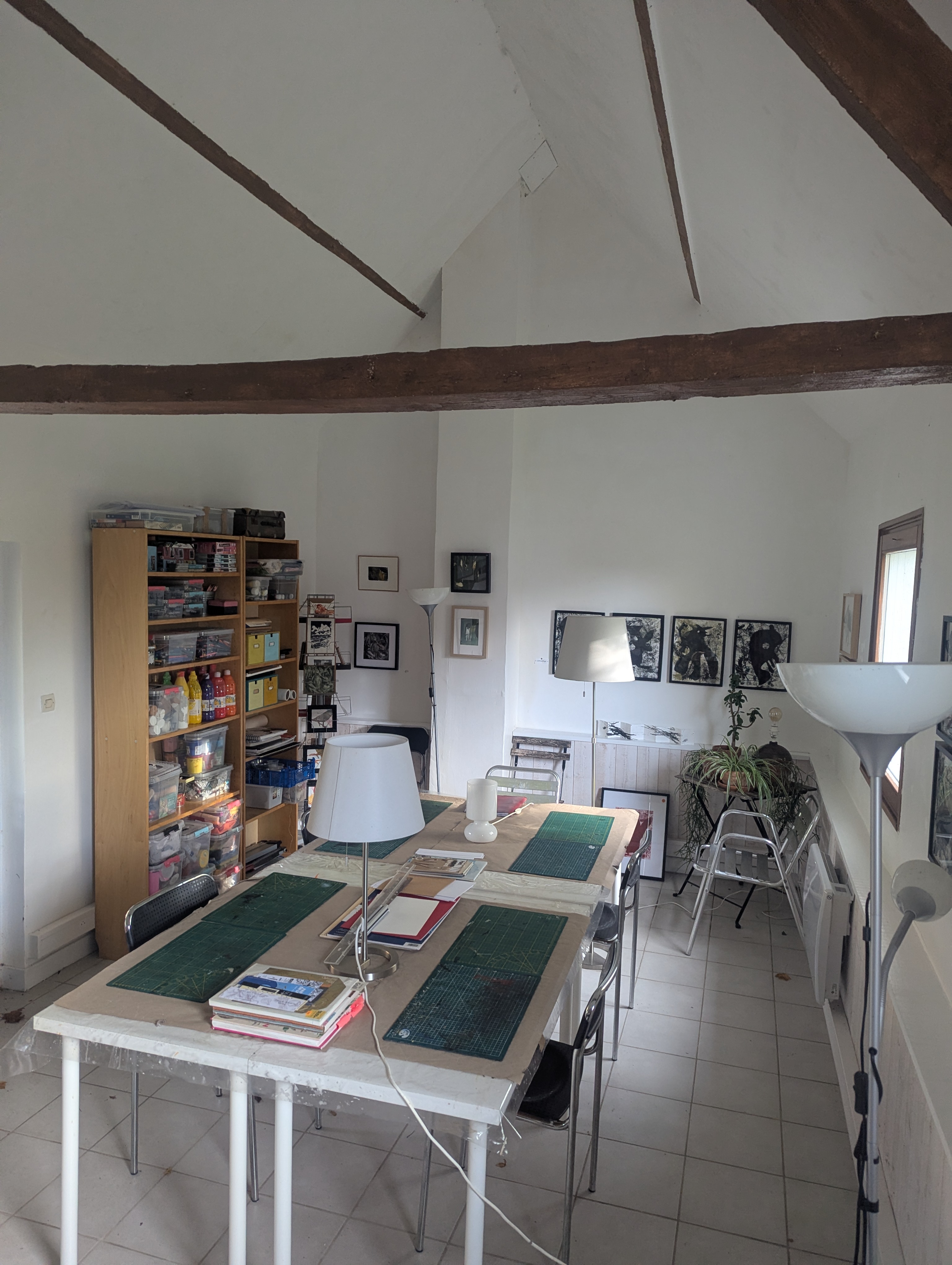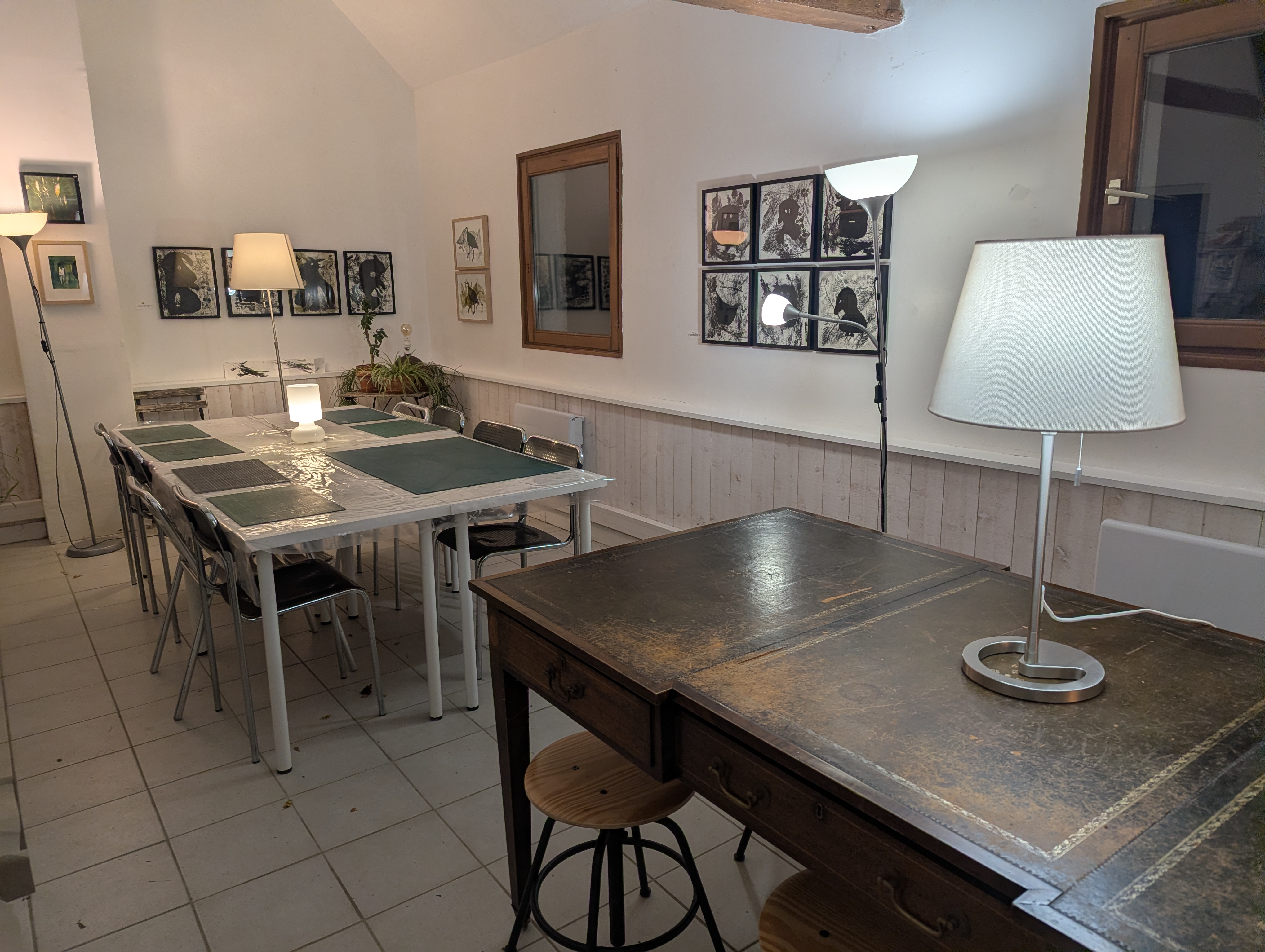 Visite de mon atelier de gravure et des salles d'exposition ainsi que des espaces prévus pour les ateliers se réalisant en extérieur (préparation papier végétal, teinture végétale...)