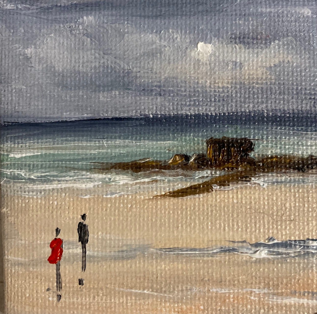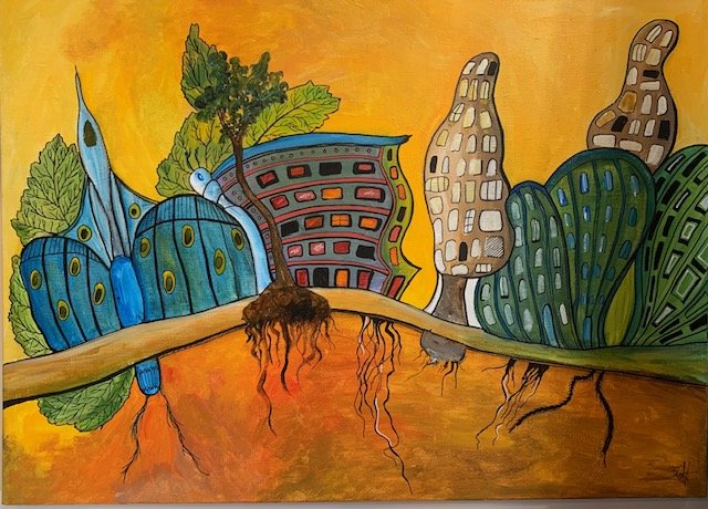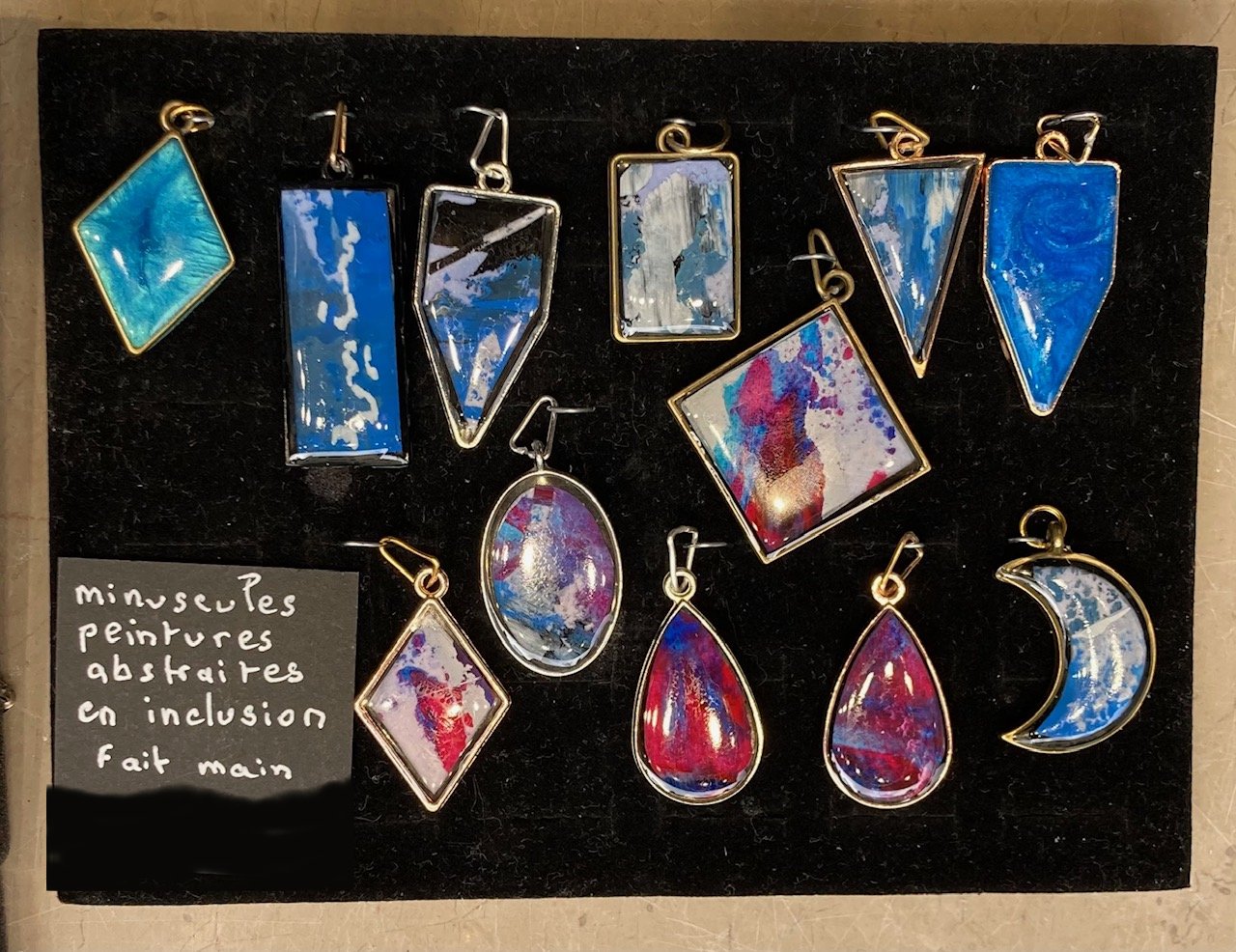 Fabrication de bijoux fantaisie en polymères recyclés et en résine avec inclusion de minuscules tableaux abstraits.