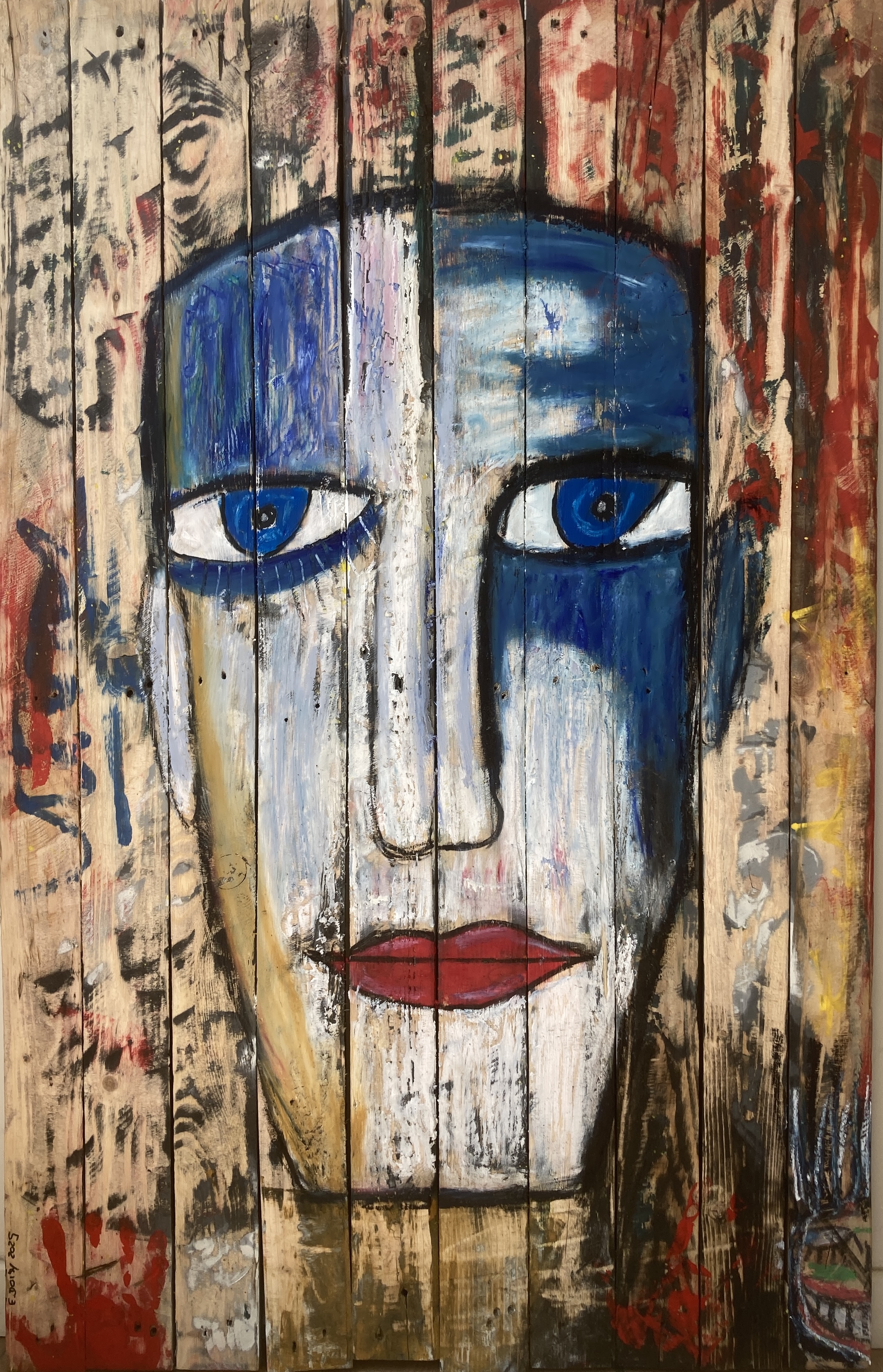 L’œuvre qui résume peut-être le mieux ce qu’il fait serait « Je ris donc je fuis ».Portée par l’instinct mais jamais gratuite, sa peinture se structure autour d’un vocabulaire graphique singulier. Une figure récurrente, ma petite tête, clown triste ou monstre s’est imposée au fil du temps. Elle devient une signature, un témoin silencieux, un double intérieur.