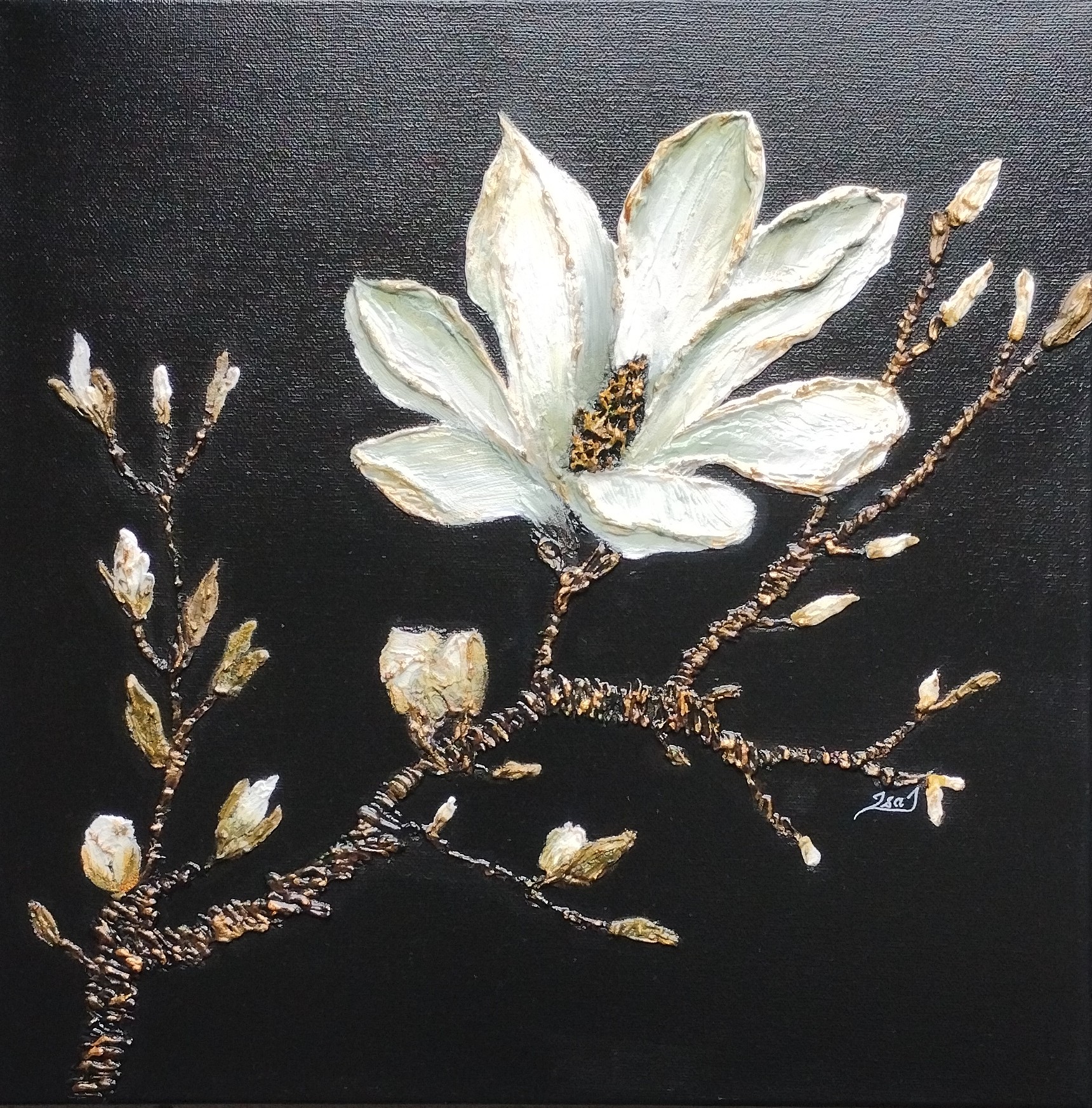 Mon art est une ode à la nature, non seulement dans ce qu’elle représente, mais aussi dans la façon dont elle est travaillée et mise en valeur à travers la matière et la composition. C’est une fusion entre le regard du paysan et celui de l’artiste, entre le geste du jardinier et celui du peintre. J’utilise différentes techniques pour créer ce relief et ces contrastes mais aussi le noir, le blanc, l’or pour sublimer ces végétaux et révéler leur fragilité et la nécessité d’en prendre soin.