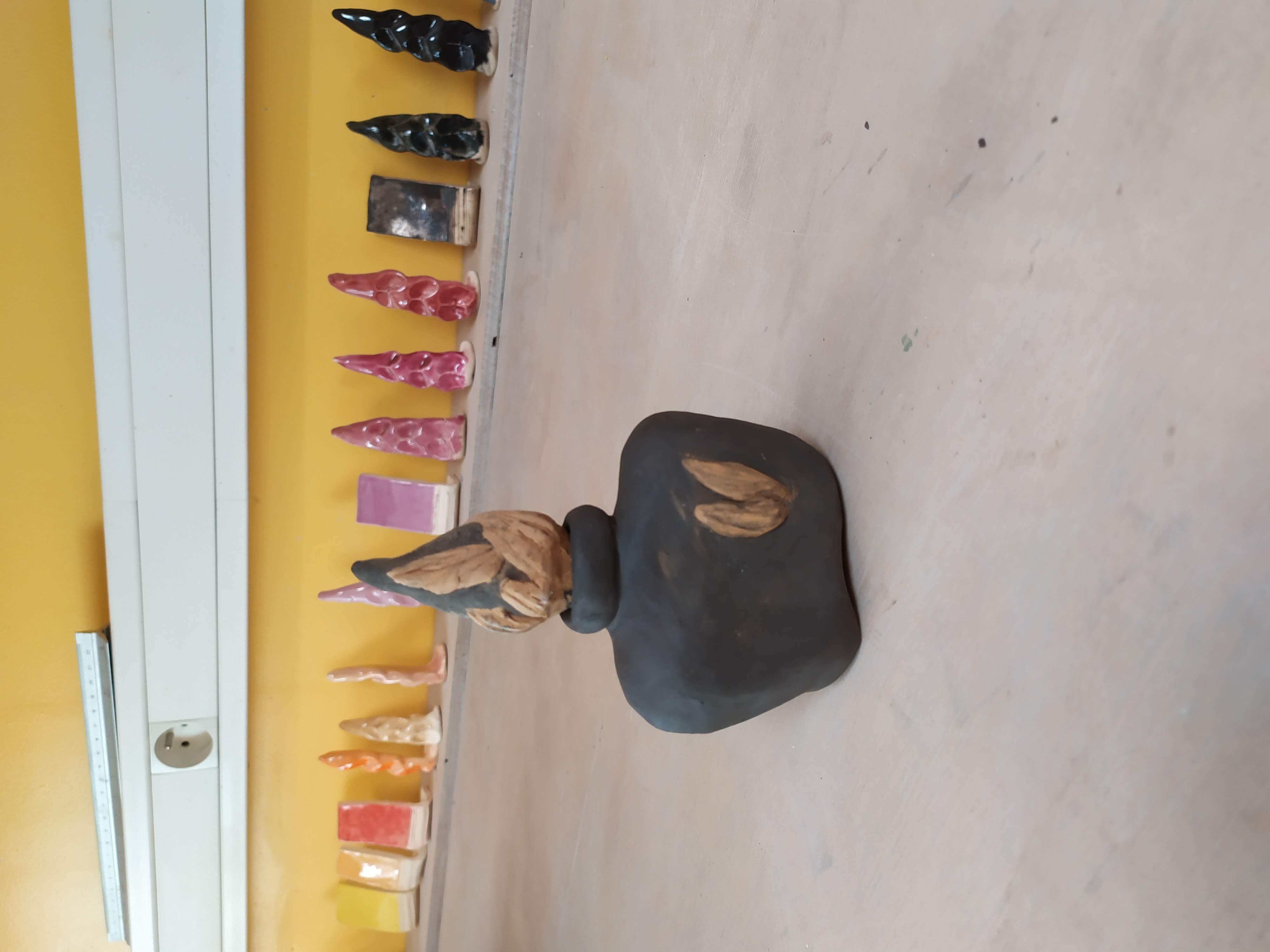 Au cours des journées ‘portes ouvertes des ateliers d’artistes’, je fais visiter mon atelier et j’explique les différentes étapes de fabrication : modelage, séchage, cuisson, émaillage.
